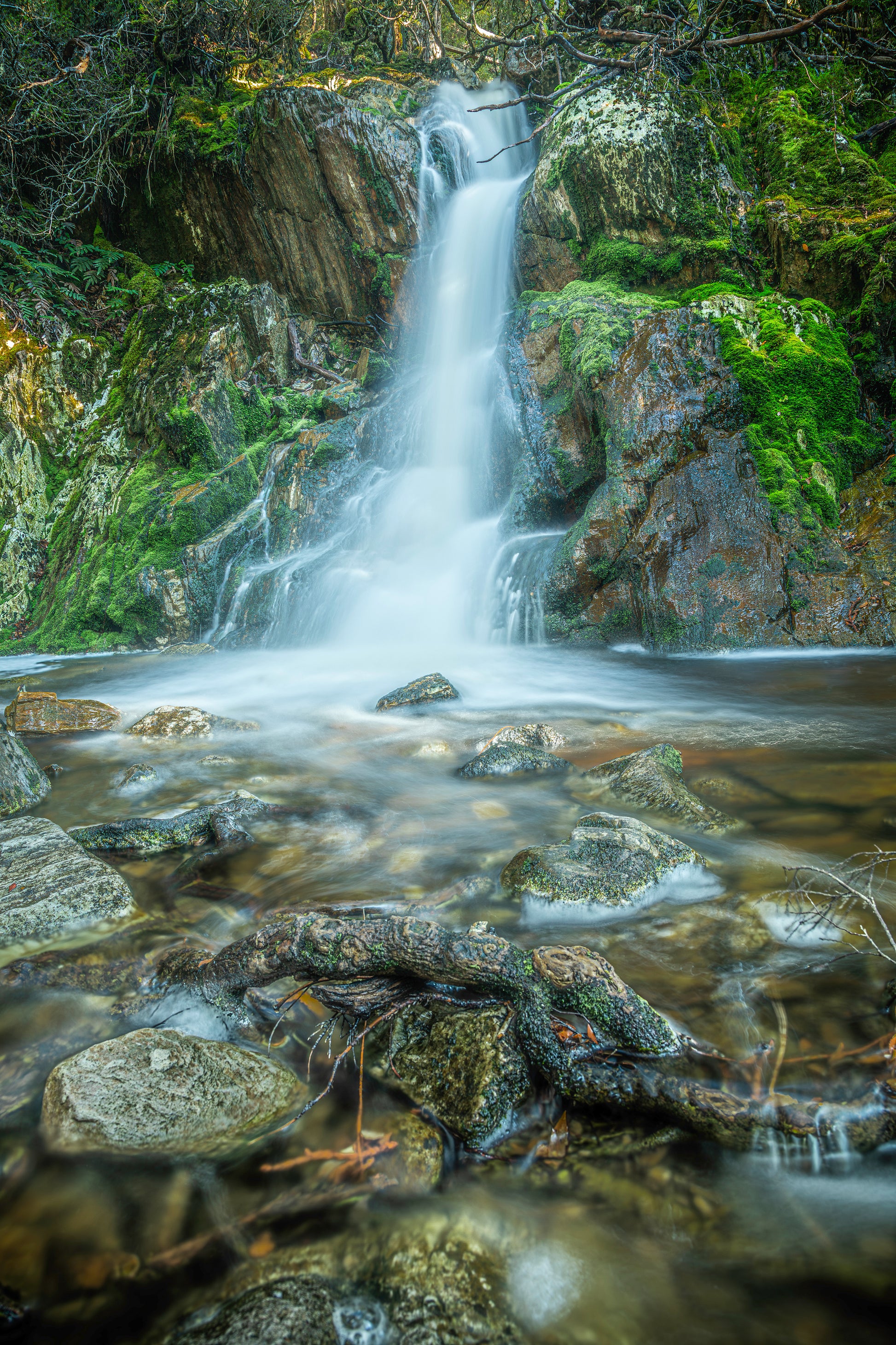 These waterfalls, hidden in the forests surrounding Cradle Mountain, are an excellent example of the pristine and unspoiled nature that Tasmania has to offer. Like a treasure, golden glimmers of sunlight adorn this scene, dominated by the soft light created by the vegetation.